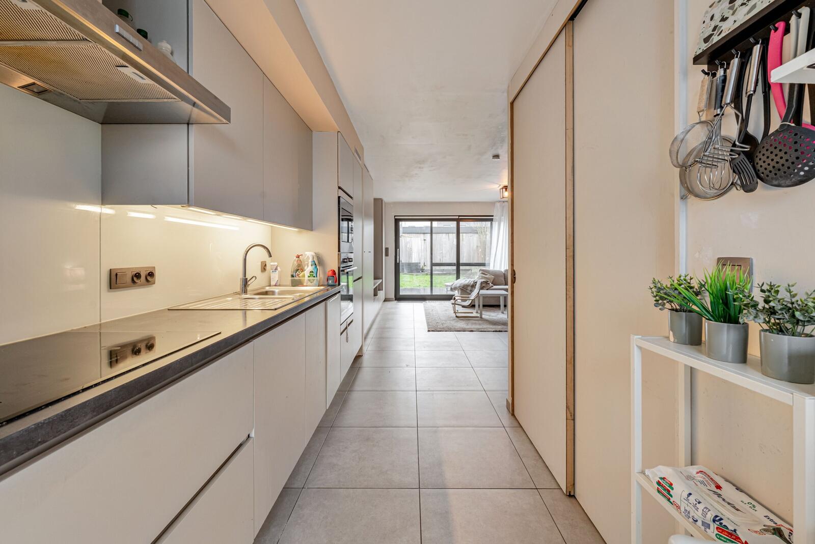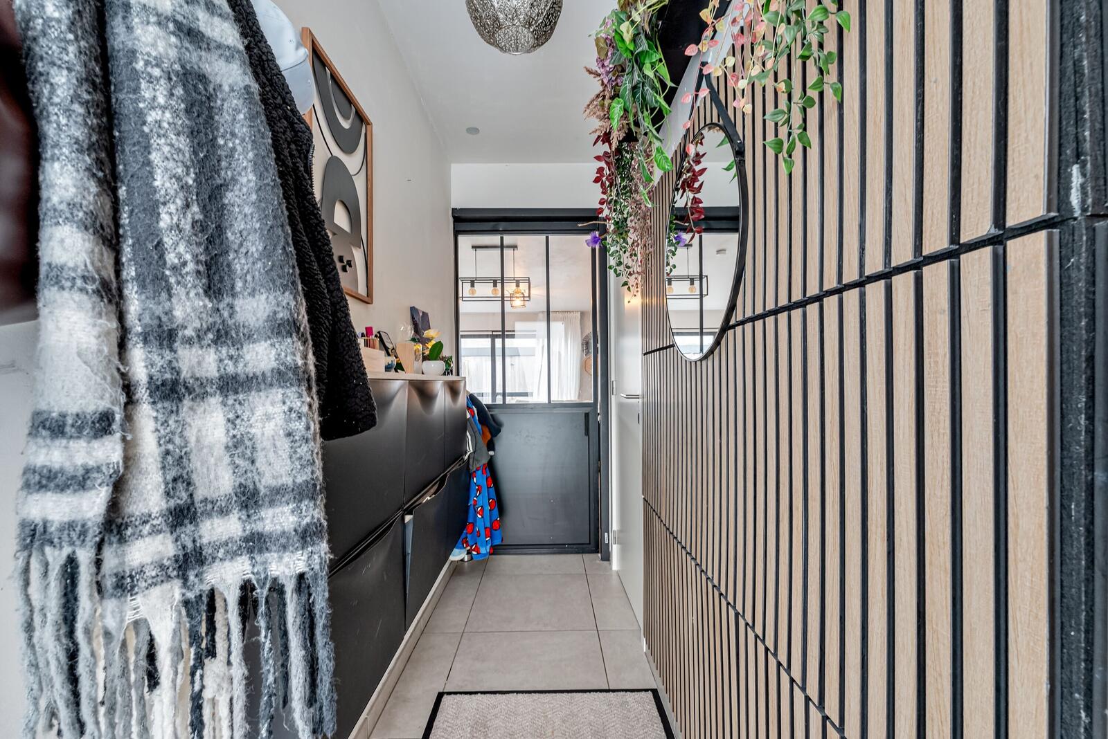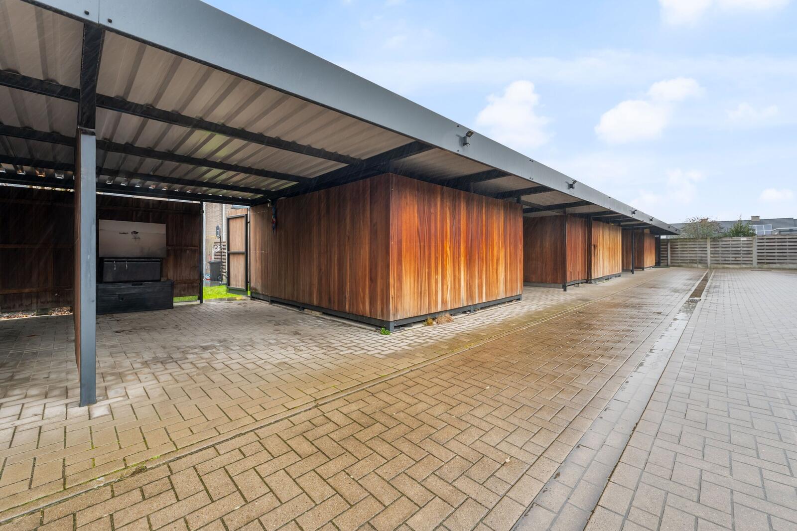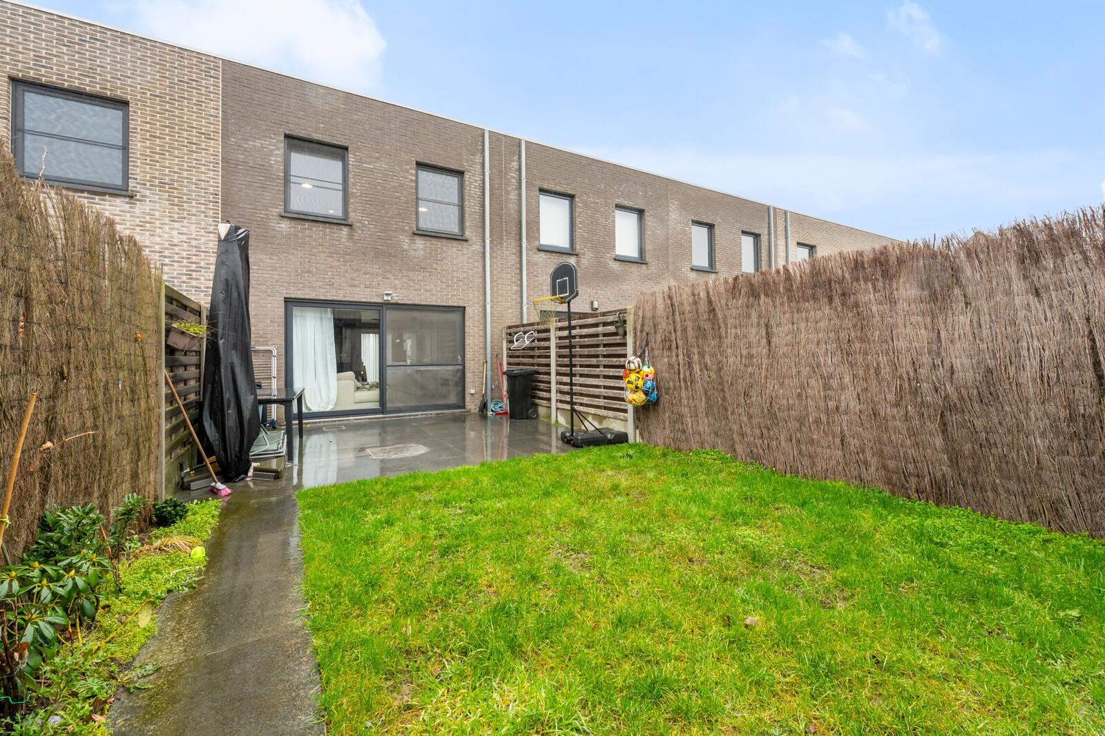 Via de inkomhal met apart gastentoilet kom je in de ruime en lichtrijke leefruimte met open, moderne keuken. Daarnaast bevindt zich een praktische berging. Via het grote schuifraam kom je naadloos op het terras en de tuin, die toegang verleent naar de carport achter de woning. Er is eveneens een praktische buitenberging. Op de verdieping hebben we drie slaapkamers, een moderne badkamer en een apart toilet