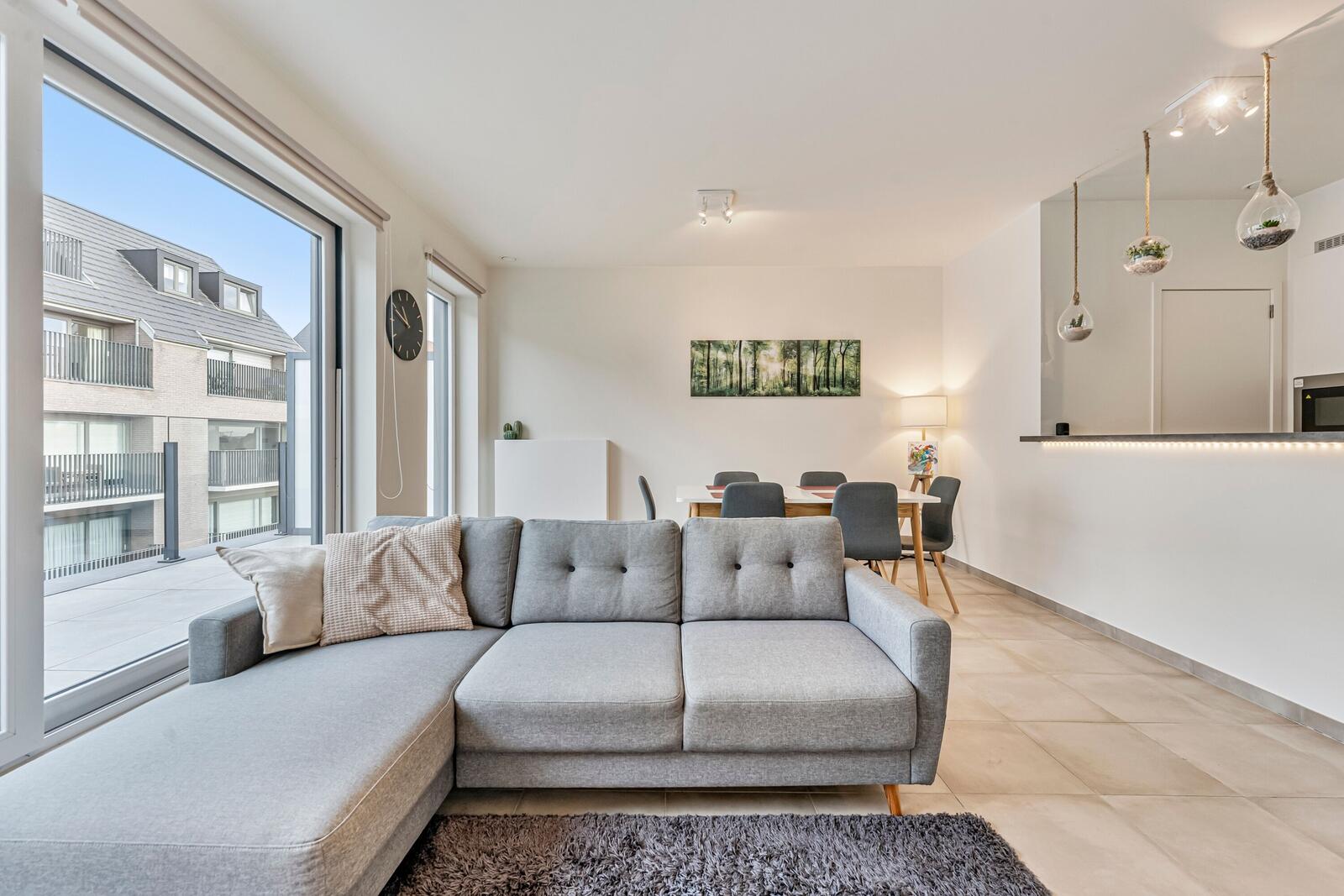 De lichtrijke leefruimte met open eet- en zithoek kijkt uit op het eerste terras. De open, volledig geïnstalleerde keuken sluit perfect aan en beschikt over een praktische berging.