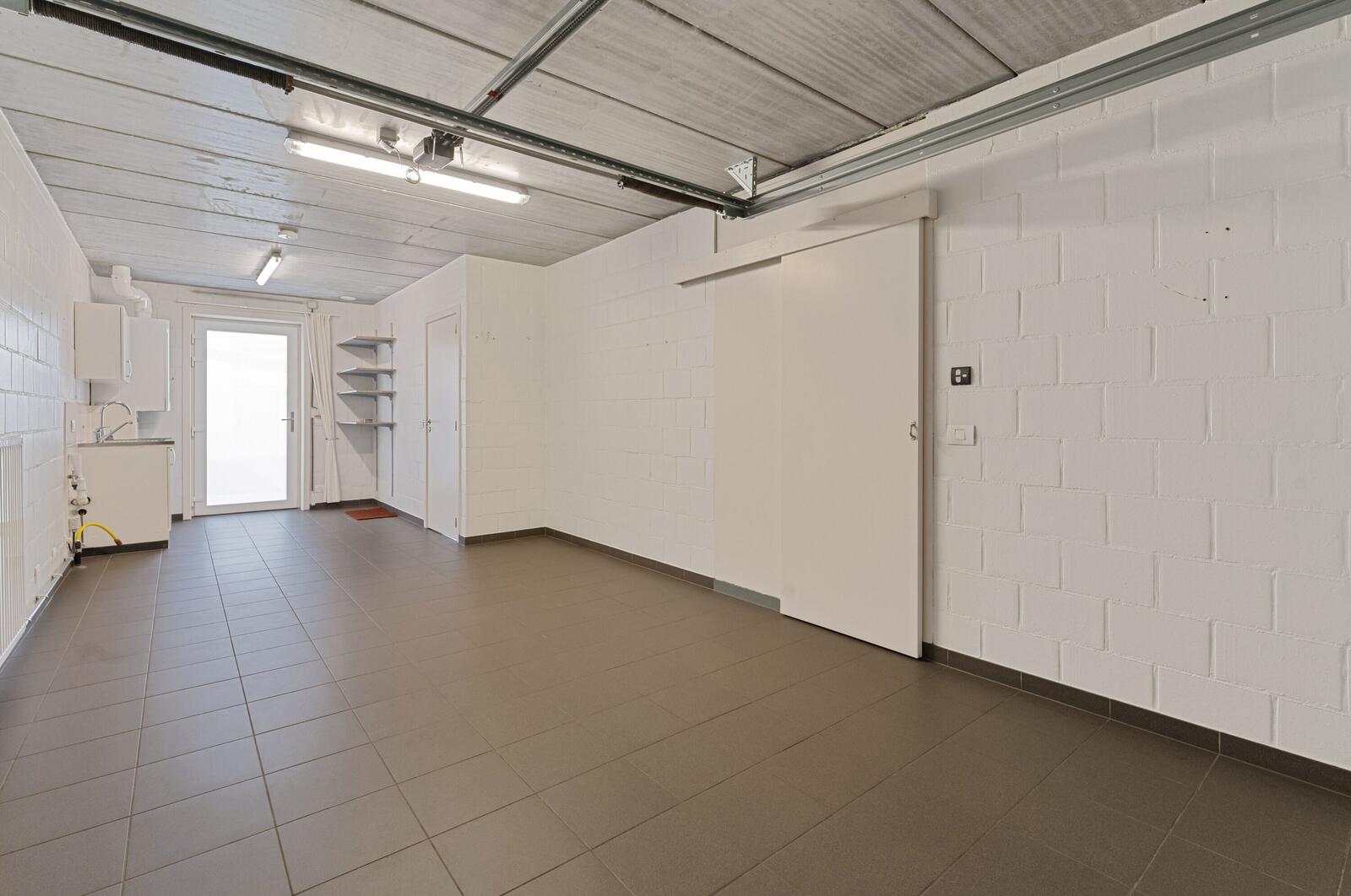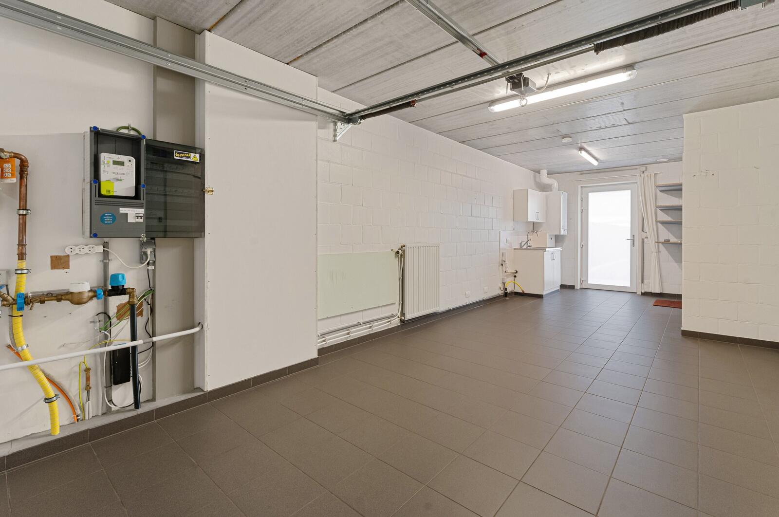 We komen binnen langs de inkomhal met een gastentoilet. Verder gaan we door naar de ruime leefruimte en open keuken waarin alle toestellen voorzien zijn. Vanuit de keuken/leefruimte kan je verdergaan naar de ruime garage met een bijkeuken.