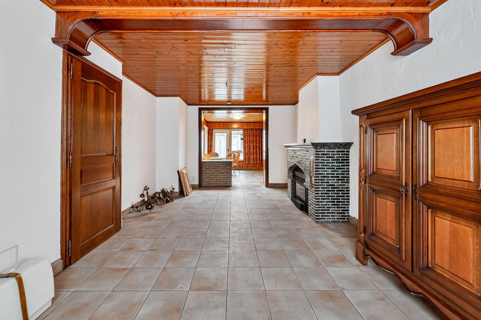 We betreden het pand via de inkomhal die doorgang heeft tot de leefruimte en keuken. Op het gelijkvloers vinden we nog de badkamer en veranda terug.
