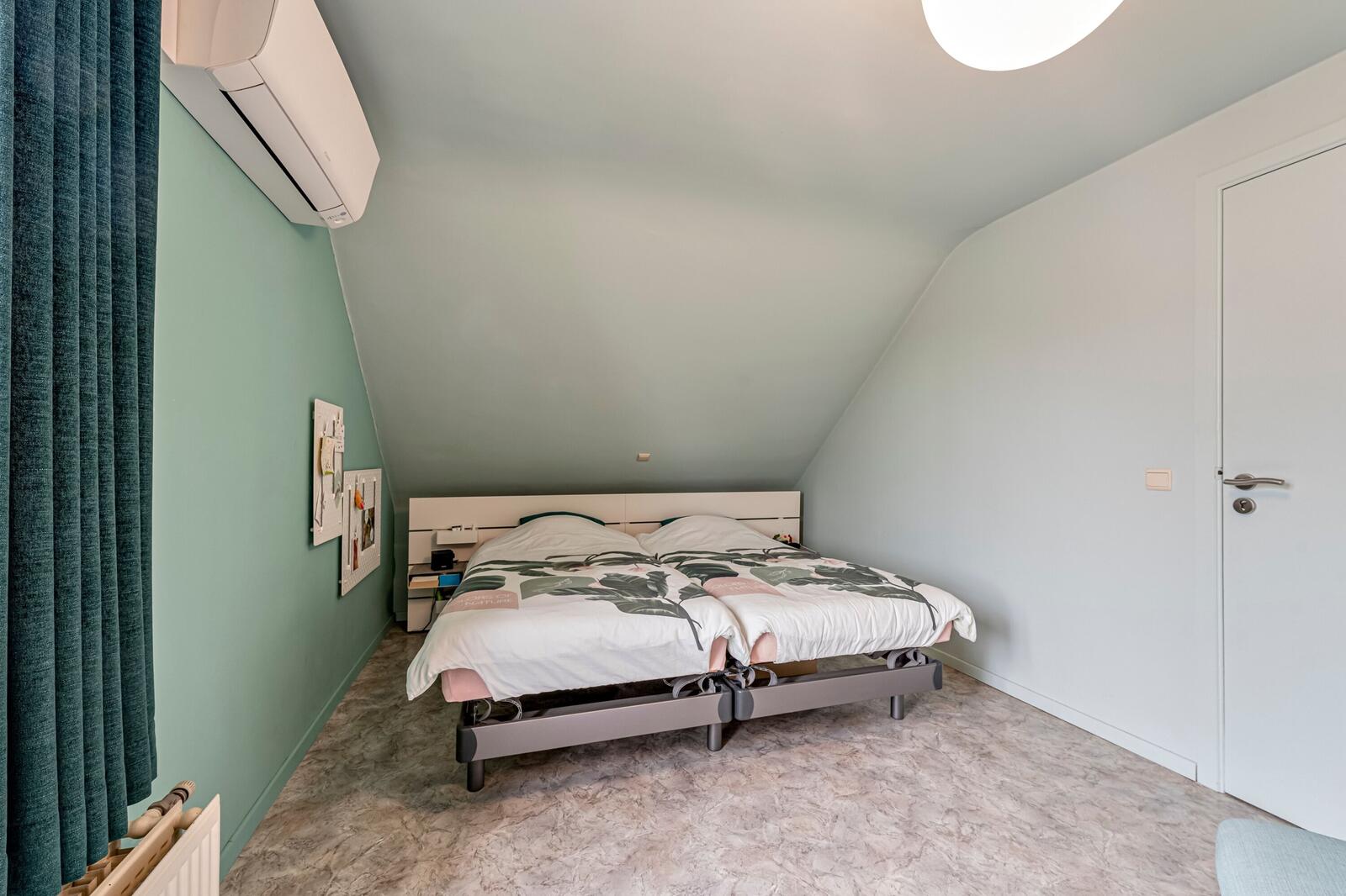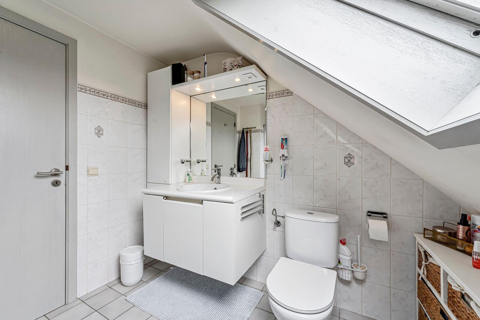 Op de eerste verdieping vinden we drie ruime slaapkamers en een badkamer met ligbad, toilet en wastafel. Een opbergzolder zorgt voor bijkomende bergruimte.