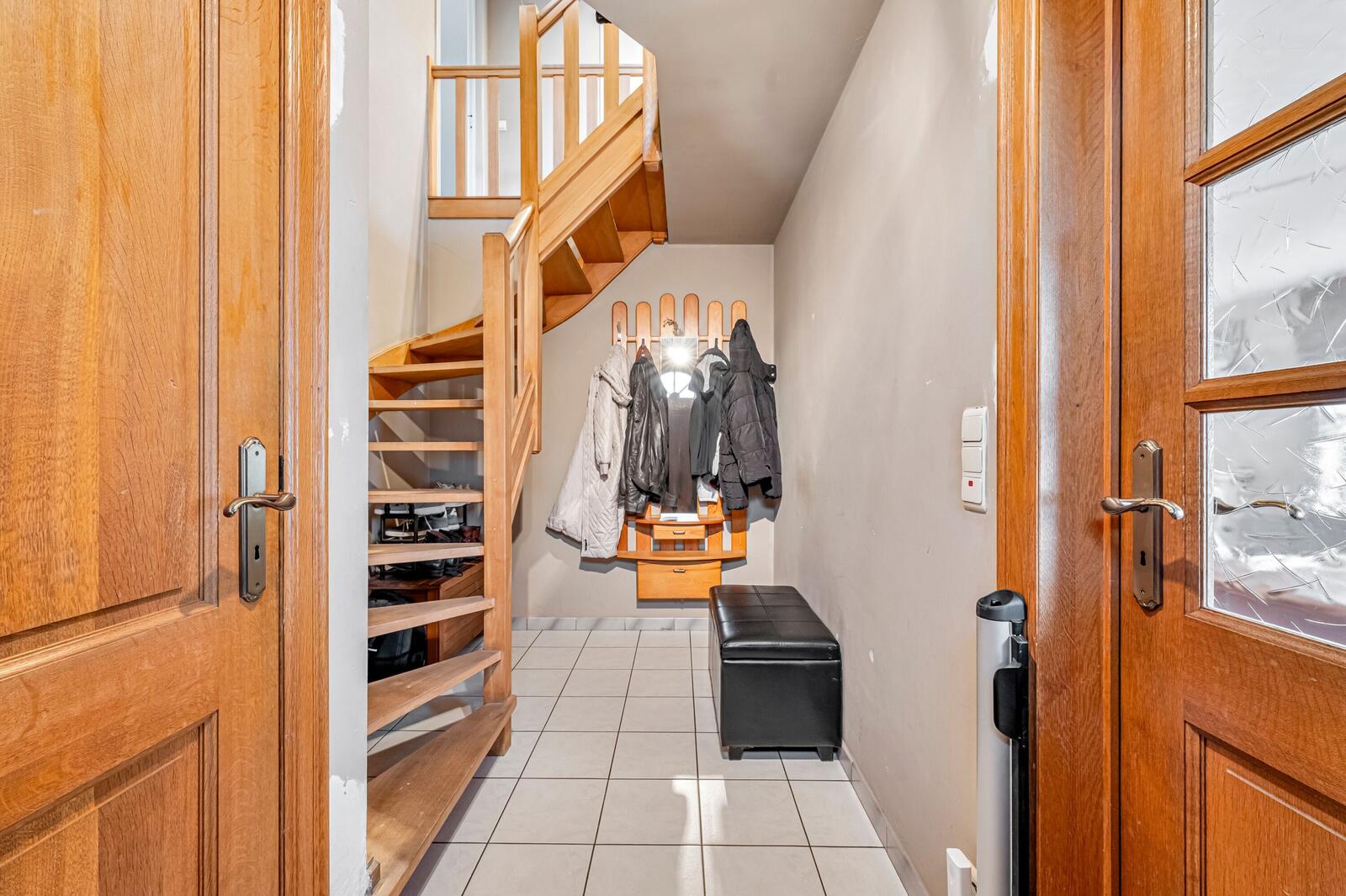 We betreden de woning via de ruime inkomhal met gastentoilet. Vervolgens komen we in de lichtrijke leefruimte met zithoek en eetplaats — een warme, uitnodigende ruimte. De volledig uitgeruste keuken biedt comfort en paalt aan de praktische berging/garage. Ook is er een verwarmde veranda die zorgt voor extra ruimte.