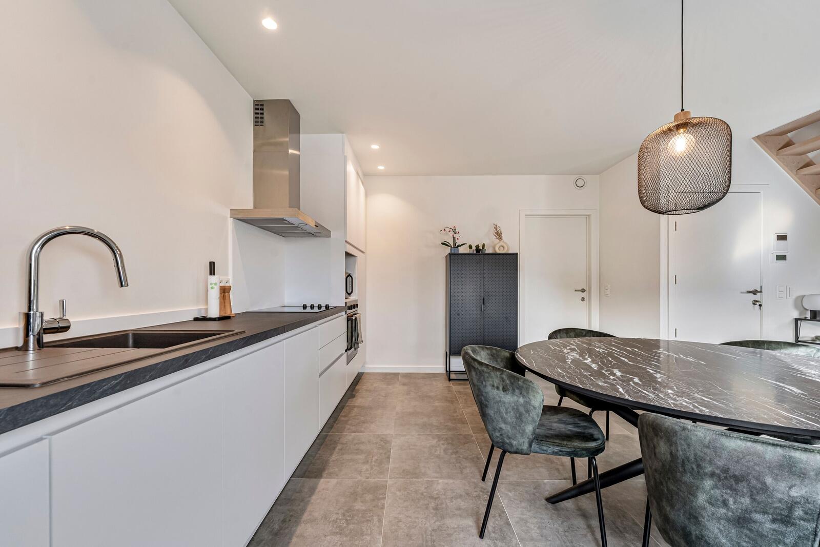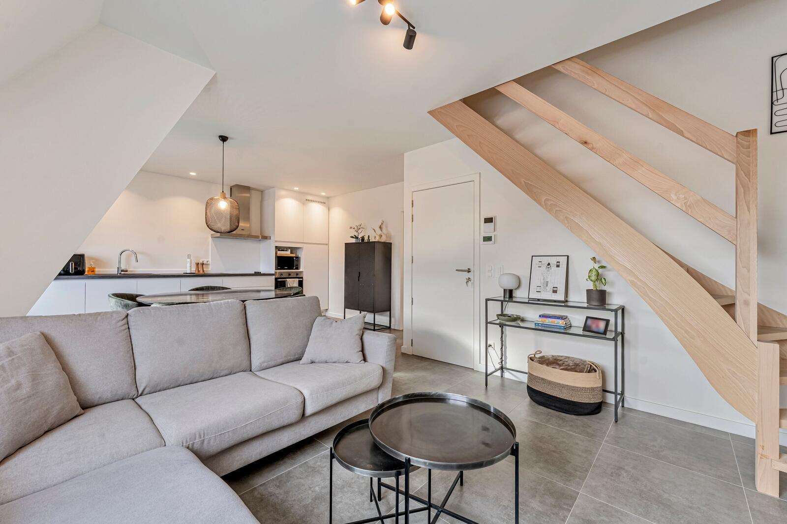 Via de inkomhal kom je binnen in de gezellige open leefruimte met een volledig ingerichte keuken voorzien van alle nodige toestellen. Verder op deze verdieping vind je een eerste slaapkamer, een apart toilet en een verzorgde badkamer met inloopdouche en lavabomeubel.