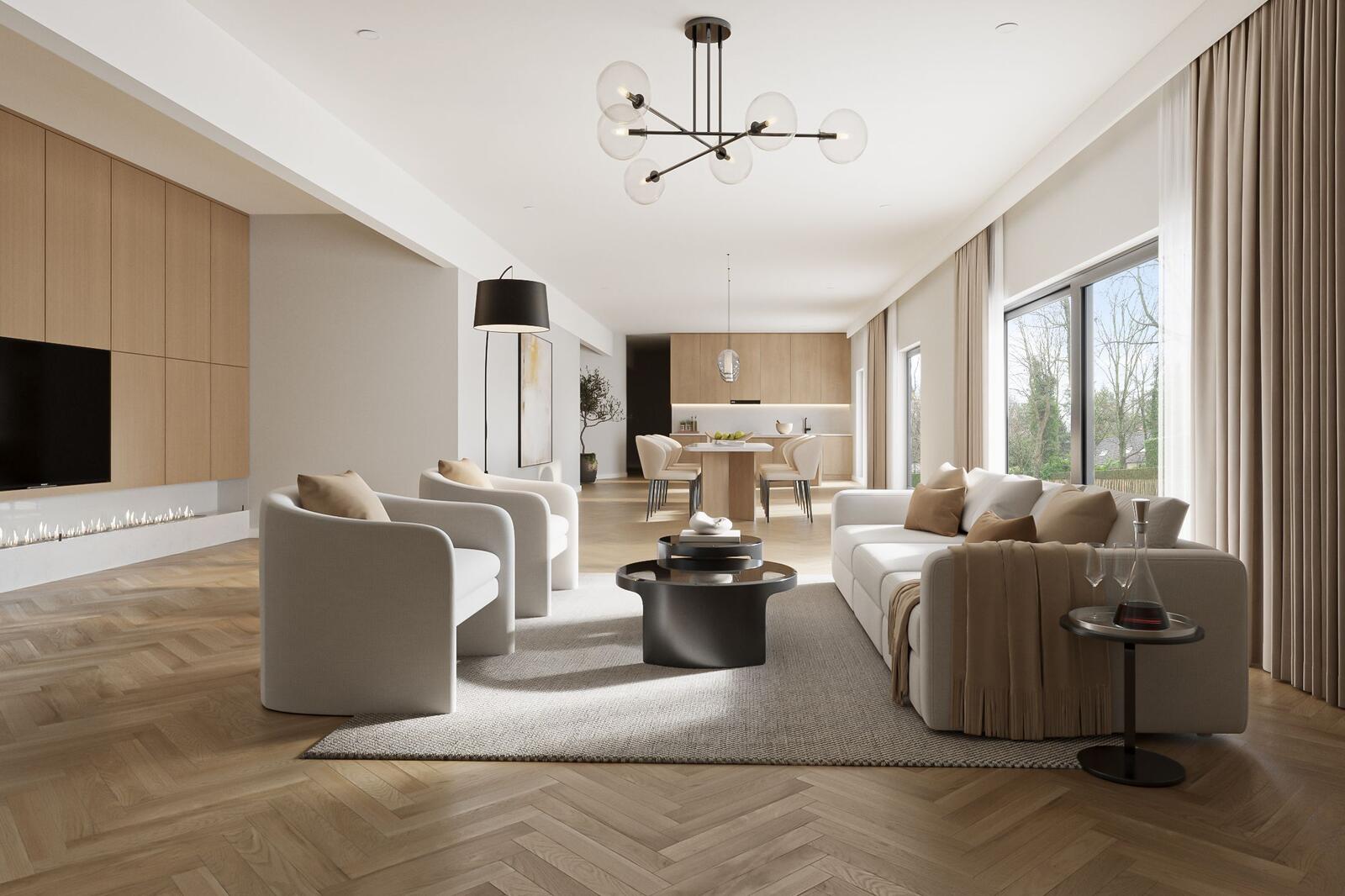 Indeling: grote open leefruimte met keukenruimte, 3 slaapkamers, 2 aparte toiletten, ruime dubbele garage en berging. Alles op het gelijkvloers zoals verplicht in de verkaveling. Weinig dragende muren → flexibel in te delen naar eigen smaak.