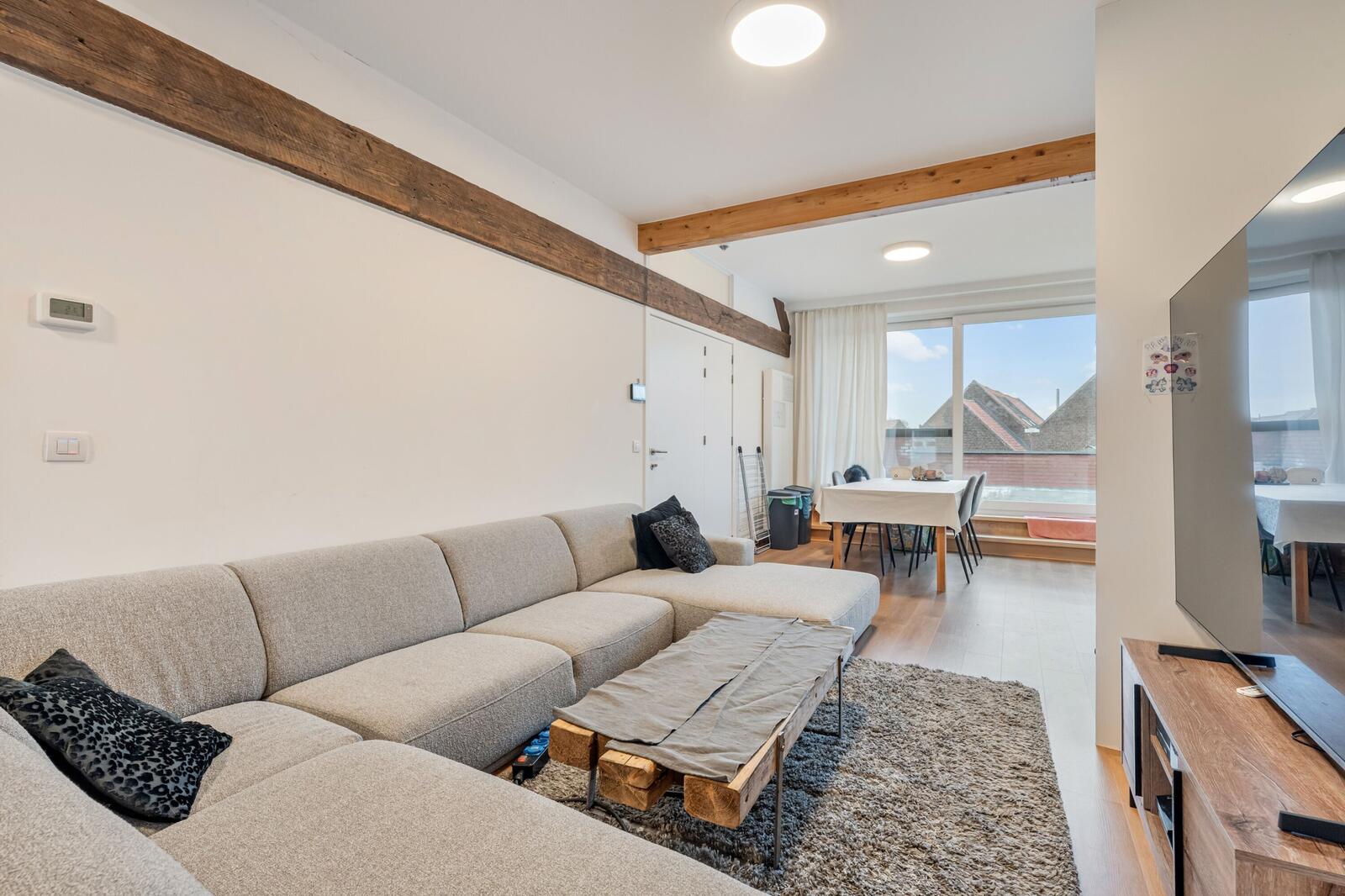 Via de vernieuwde vaste trap bereiken we de eerste verdieping. Hier vinden we een apart toilet en de lichtrijke leefruimte met volledig vernieuwde keuken, eetplaats en zithoek. Vanuit de leefruimte heb je toegang tot het aangename dakterras.