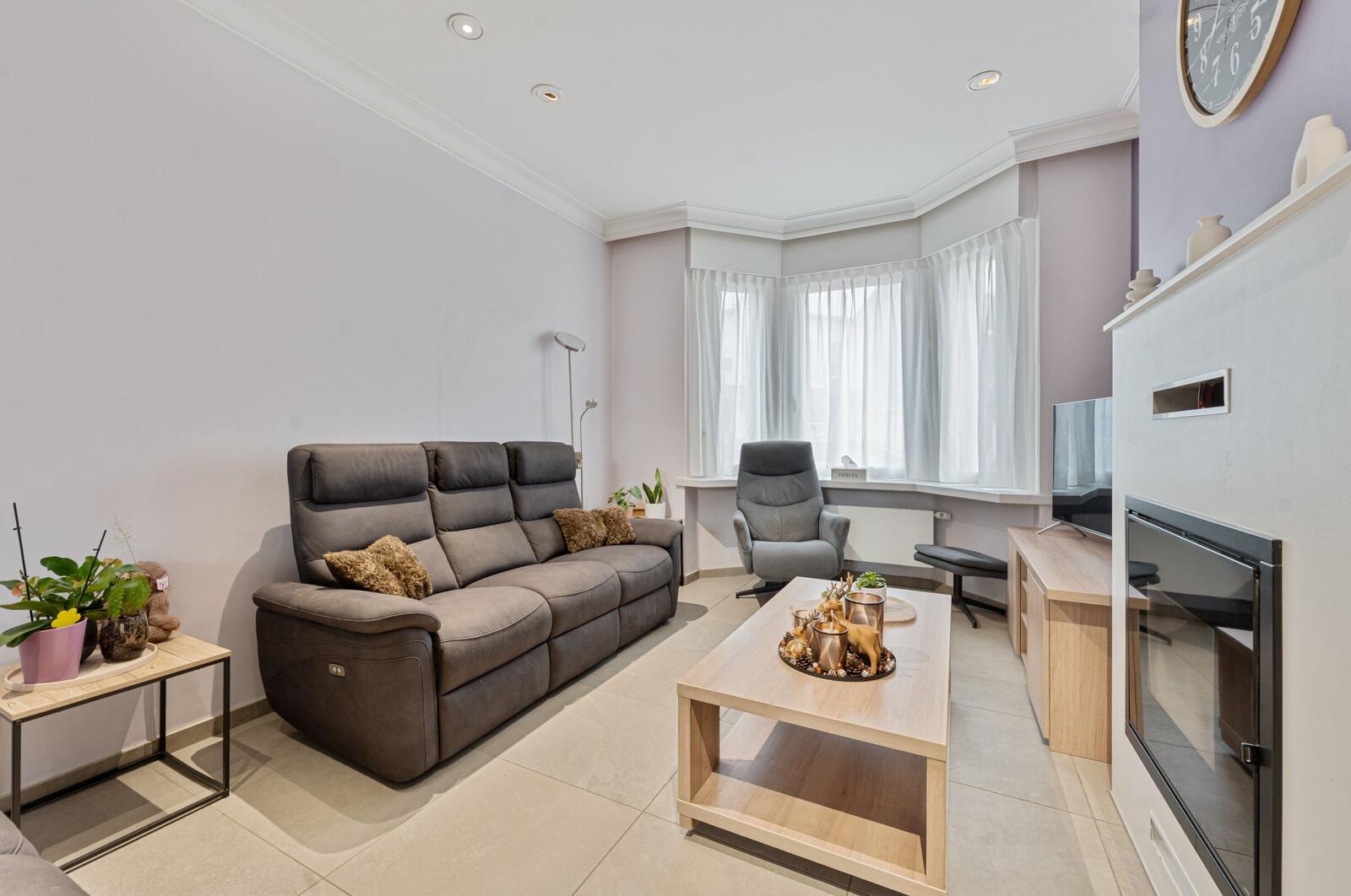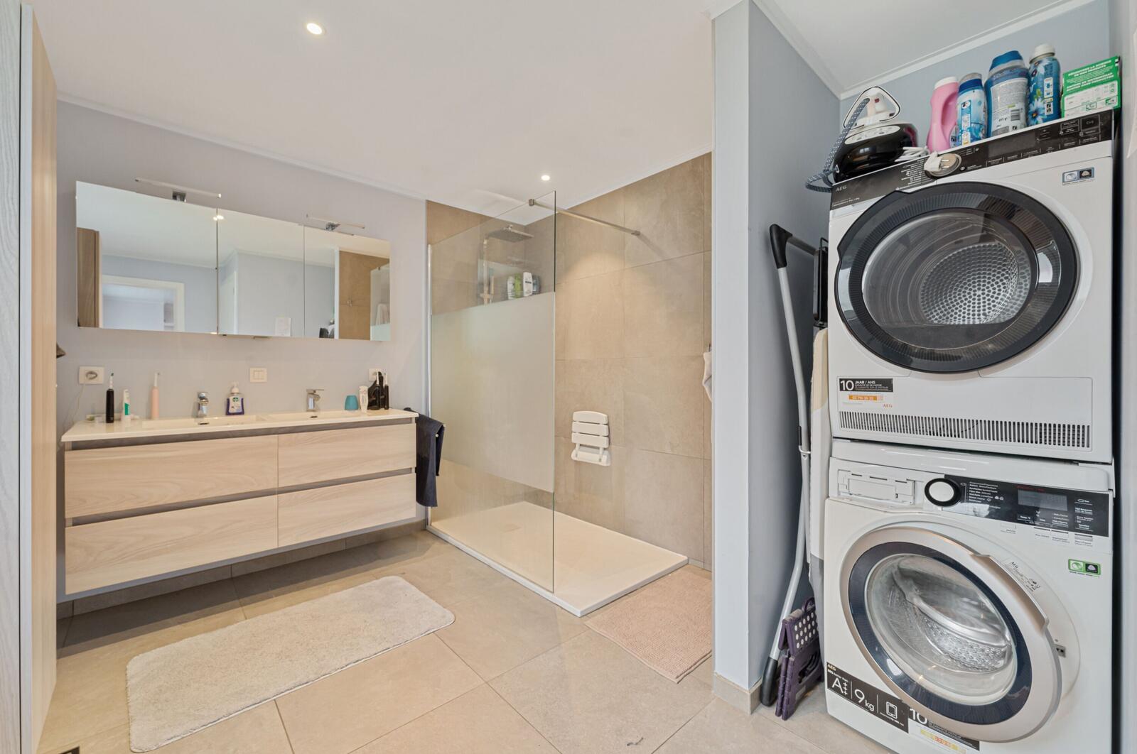 Via de inkomhal betreden we de woning en komen we in de gezellige leefruimte met zithoek en eetplaats. Aansluitend bevindt zich de volledig ingerichte keuken, voorzien van alle nodige toestellen en met toegang tot de kelder. Op het gelijkvloers vinden we verder een zeer ruime badkamer met dubbele lavabo, inloopdouche, aansluiting voor wasmachine en een apart toilet.