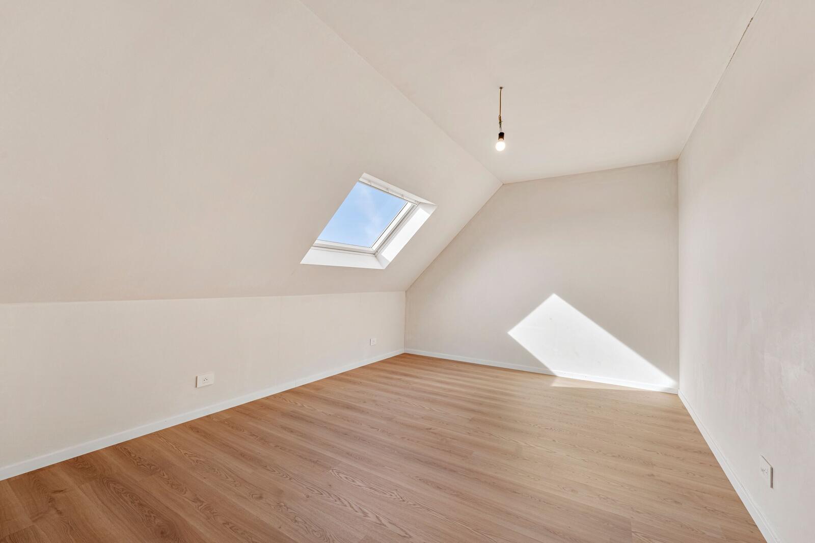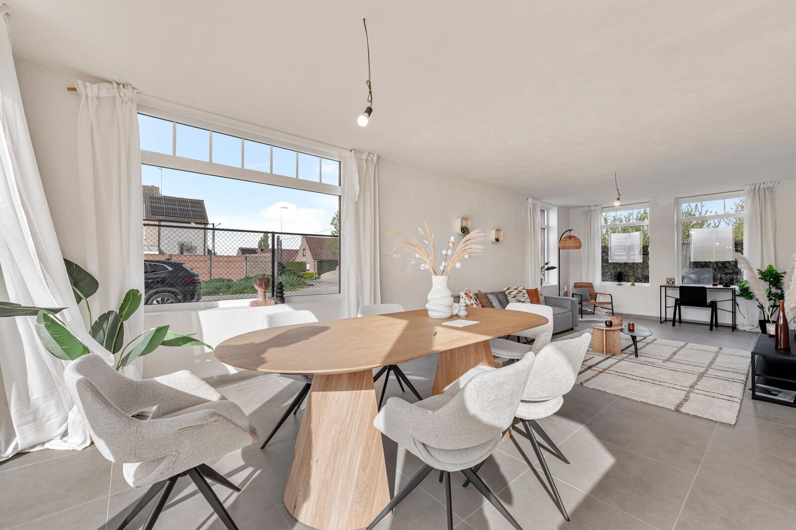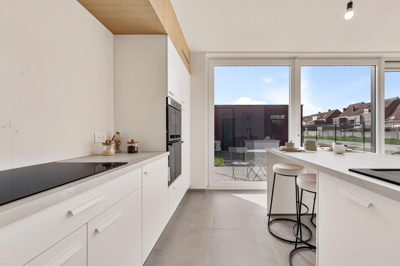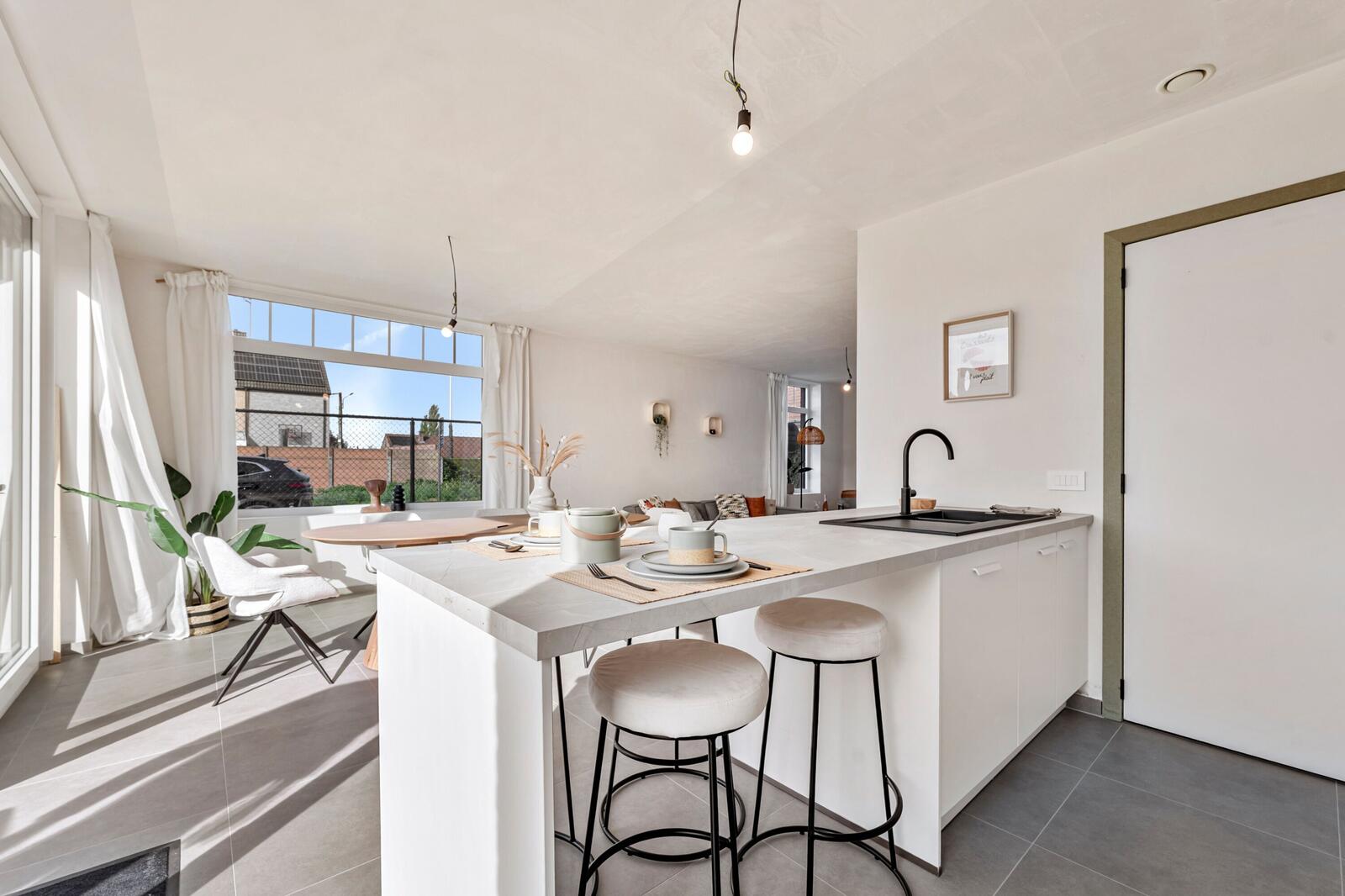 De grote woon-eetkamer beschikt over veel natuurlijk lichtinval, daarnaast kan je een open keuken met keukeneiland terugvinden. Ook heb je een praktische berging vlakbij.
