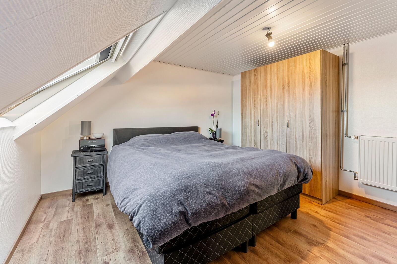 Op het tussen verdiep hebben we een doucheruimte met toilet. Op de eerste verdieping hebben we drie slaapkamers en een berging met toegang tot de zolder.