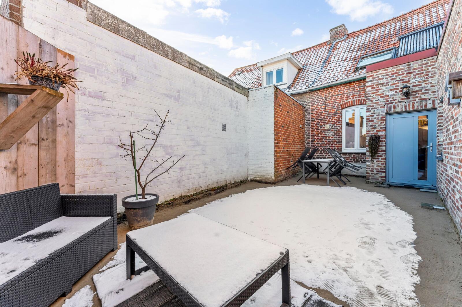Buiten hebben we een gezellige koer met toegang tot de garage. De garage is ideaal als berging/wasplaats en parking voor een auto.