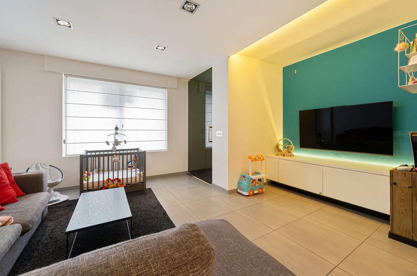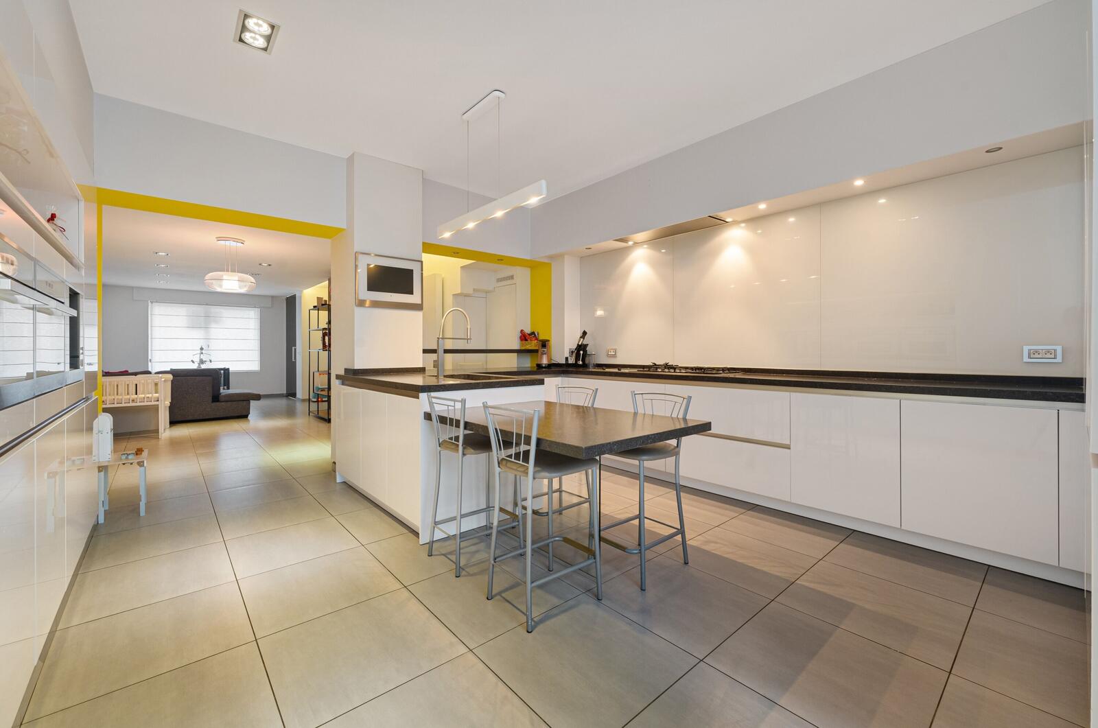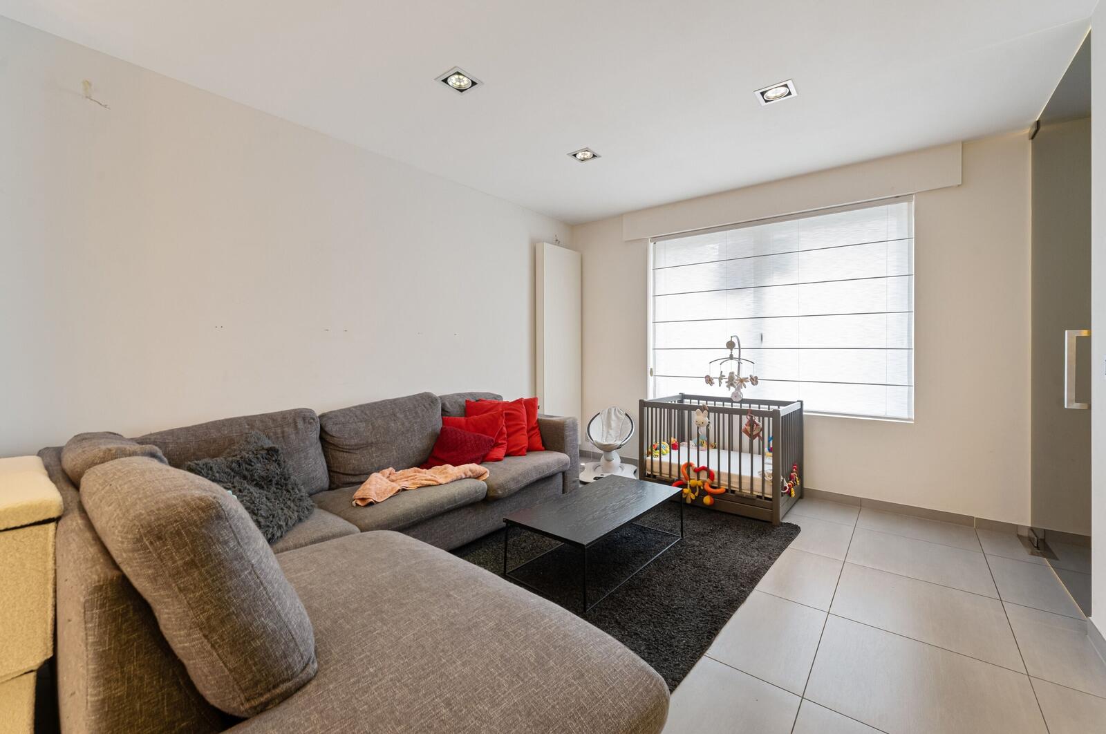 Bij het binnenkomen komen we meteen in de zithoek terecht. Aansluitend is er voldoende ruimte voor een eetplaats. Verder in de woning bevindt zich de keuken, voorzien van nodige toestellen, met zicht op alle ruimtes op de gelijkvloers.