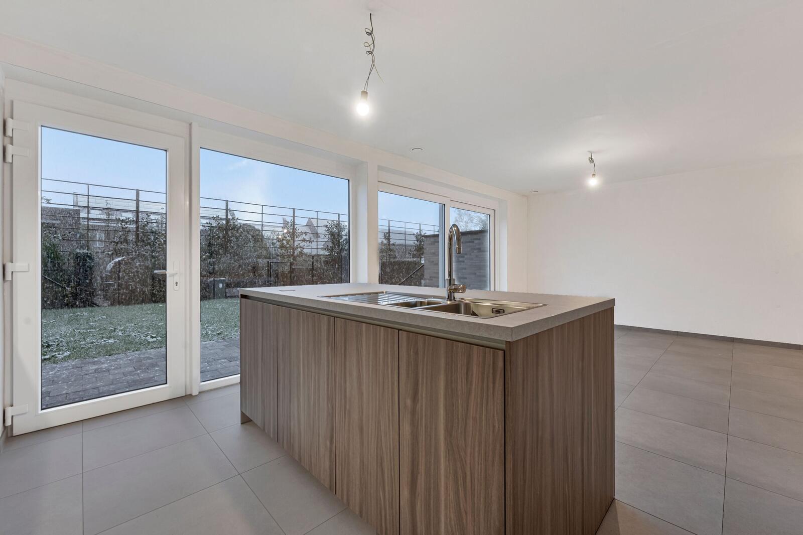Deze volledig afgewerkte woning, volledig nieuwbouw wordt te huur aangeboden. We komen binnen langs de inkomhal met een gastentoilet. We gaan verder naar de ruime leefruimte met een open keuken. De keuken werd voorzien van alle toestellen en keukeneiland. Vanuit de leefruimte is er toegang tot de tuin en aangelegd terras.