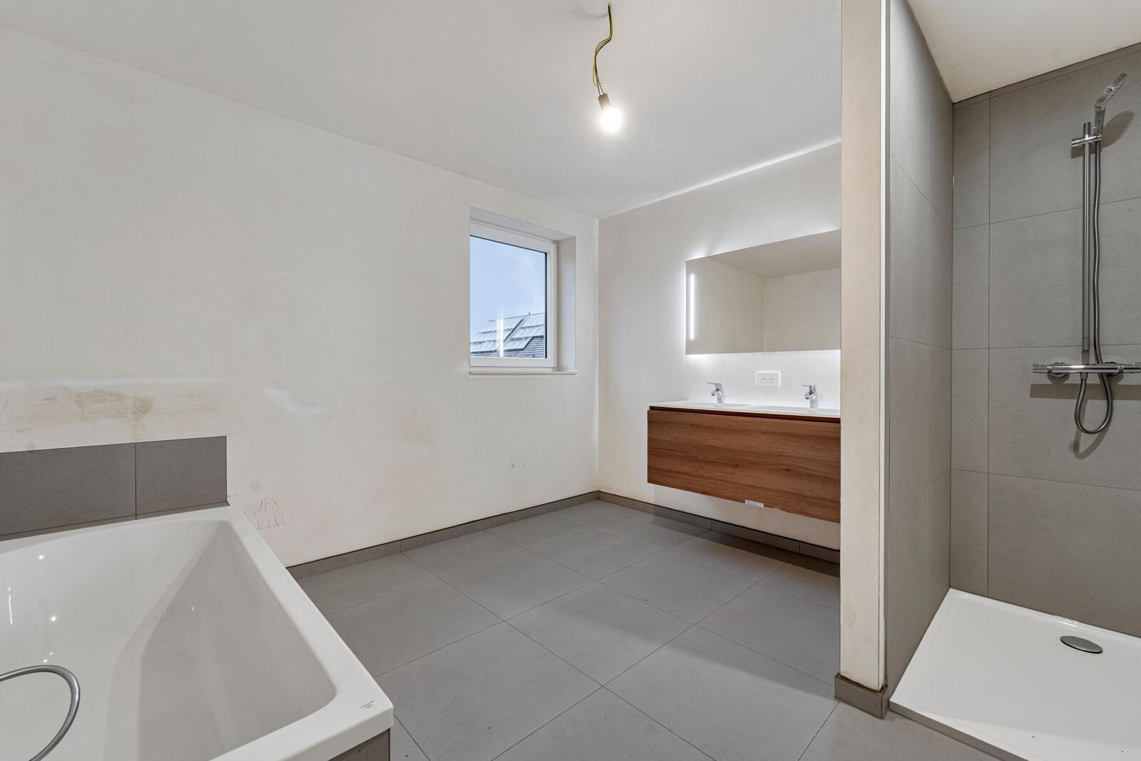 Op het eerste verdiep zijn er 3 slaapkamers voorzien, een ruime badkamer zowel ligbad als inloopdouche en een afzonderlijk tweede toilet. De zolder werd ook volledig ingericht tot een vierde slaapkamer en een aparte ruimte die kan dienen als bergruimte.