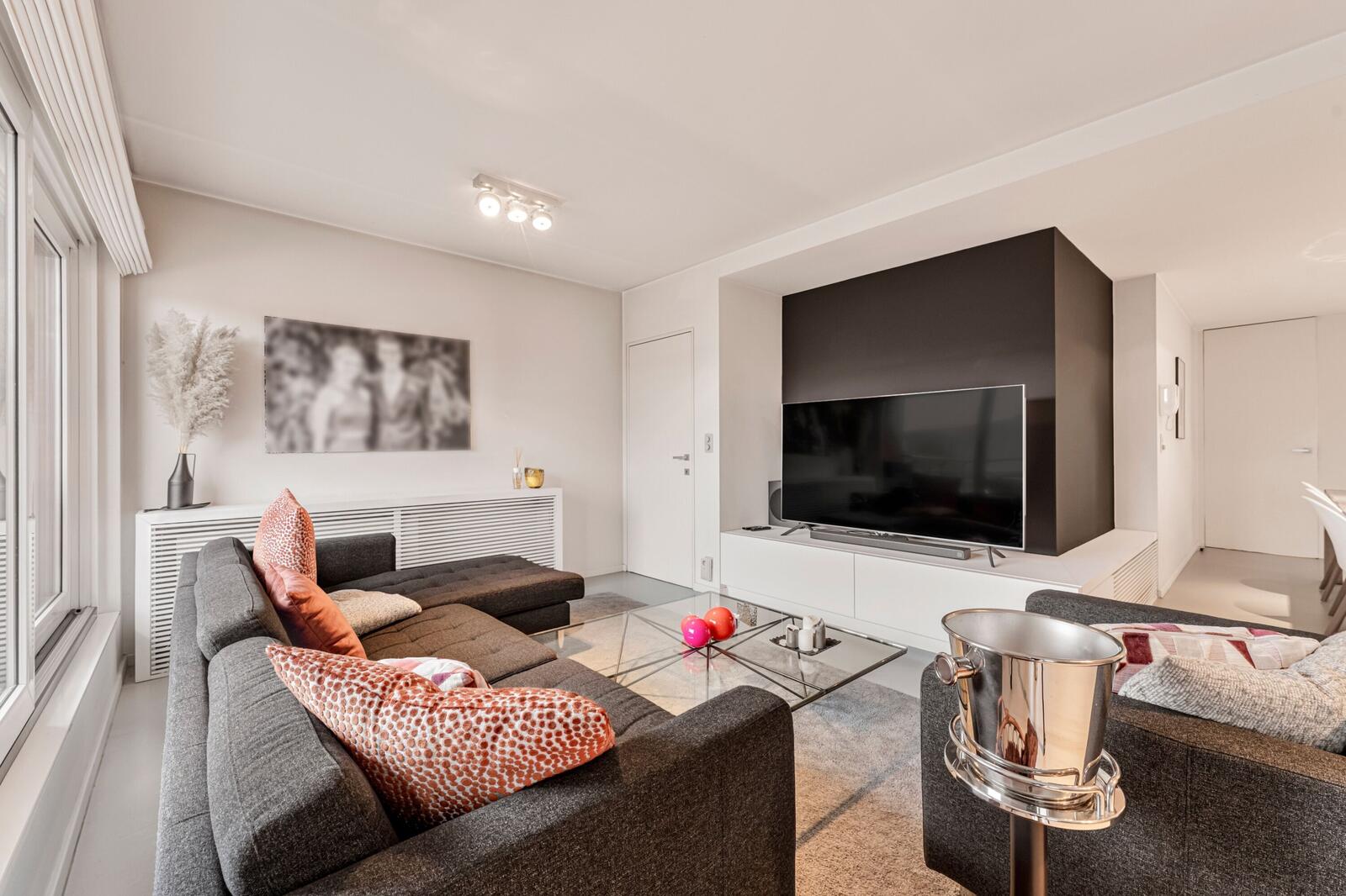 We betreden het appartement via de inkomhal met gastentoilet en een praktische vestiaire met ingebouwde dressing. Vervolgens komen we in de gezellige leefruimte met zithoek en eetplaats, die beide uitkijken op het terras. Dankzij het grote schuifraam geniet je hier de hele dag van aangenaam natuurlijk licht.