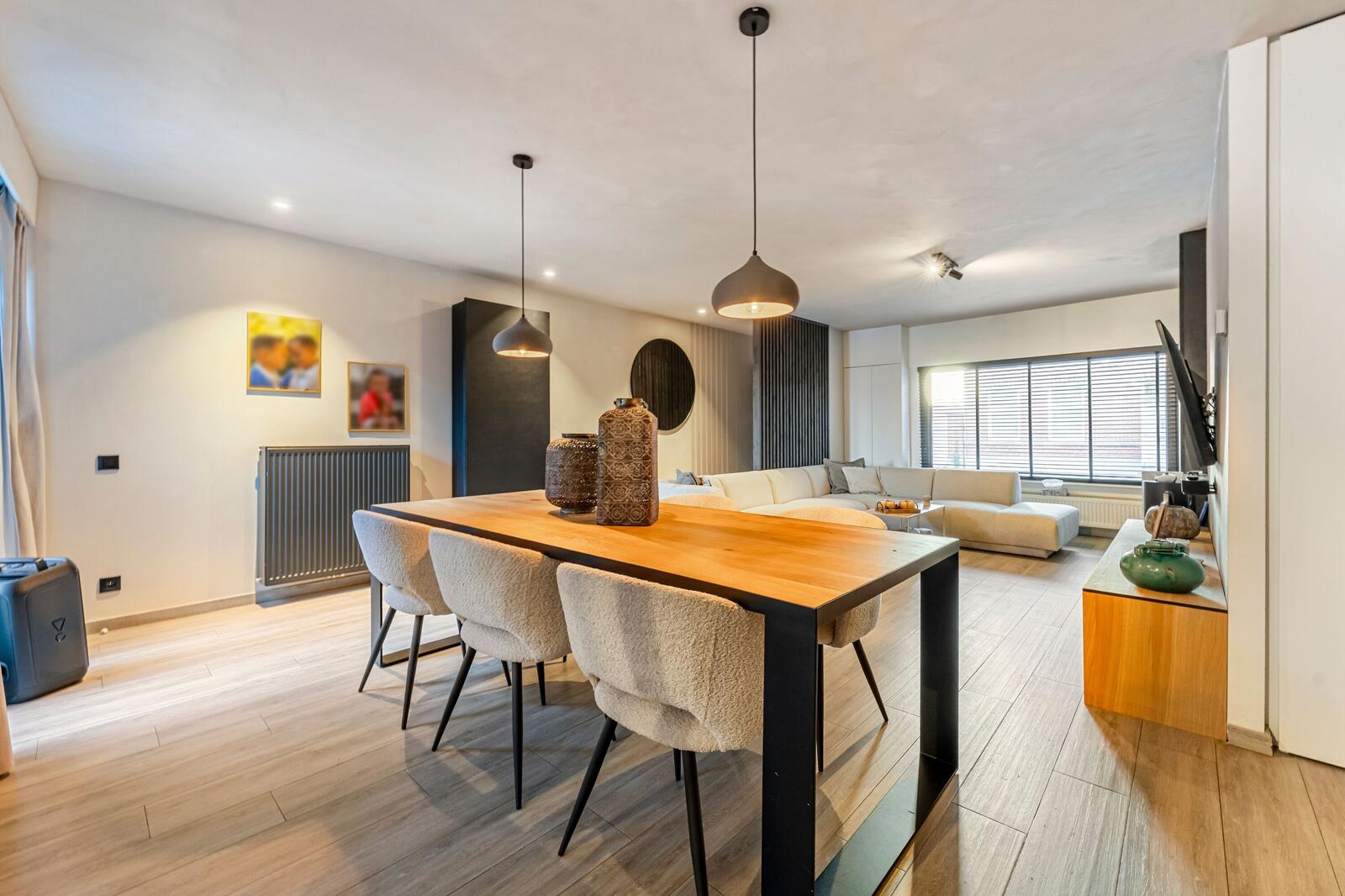 We betreden de woning via de inkomhal en worden vervolgens verwelkomd door de gezellige leefruimte met zithoek en eetplaats. Aansluitend hebben we de open keuken, voorzien van alle nodige toestellen, met eiland waar je aan kunt eten.