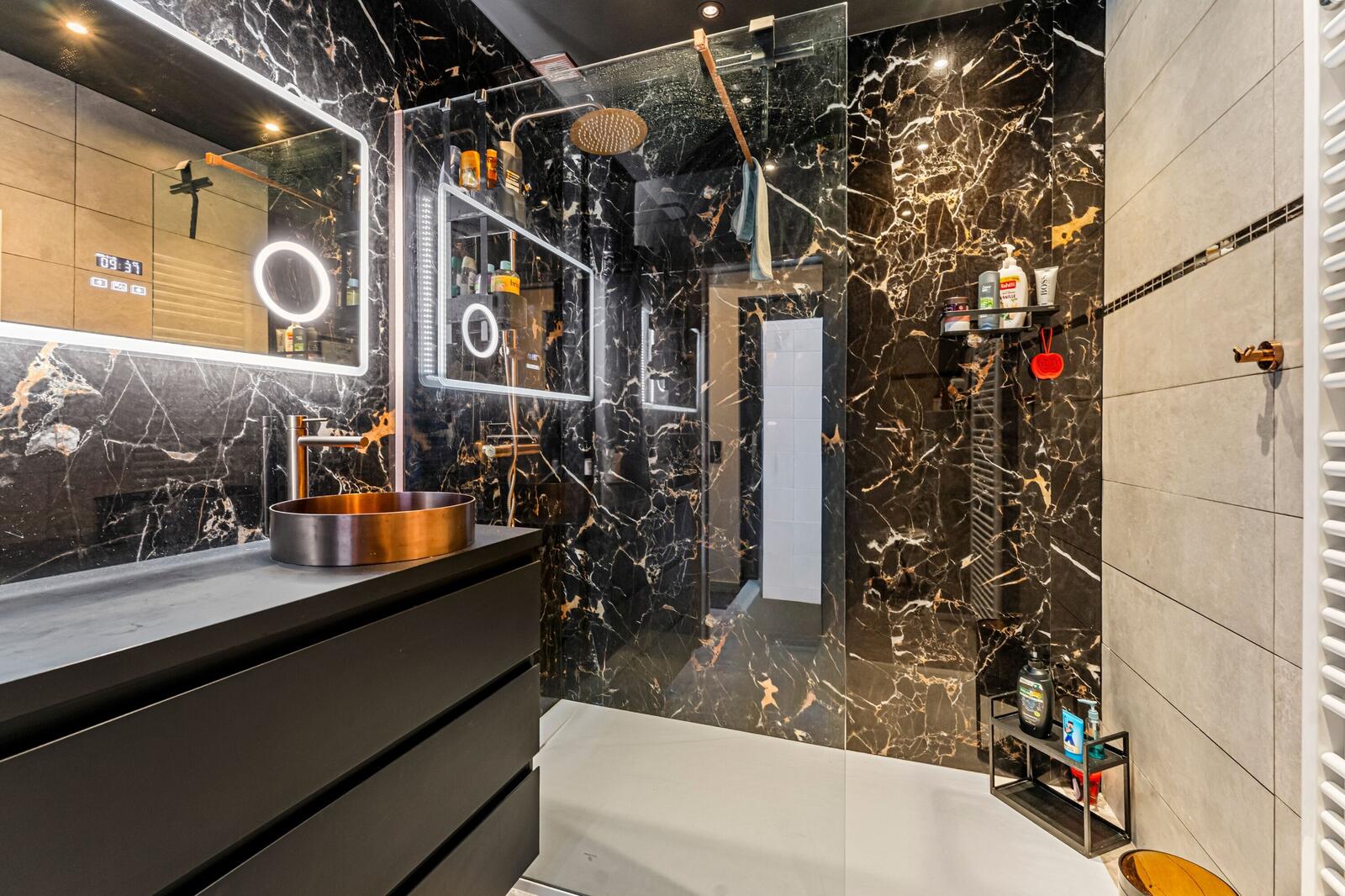 Verder hebben we hier een ruime eerste slaapkamer en de badkamer met inloopdouche, toilet en stijlvol lavabomeubel. Hier vinden we ook nog 2 handige bergingen.