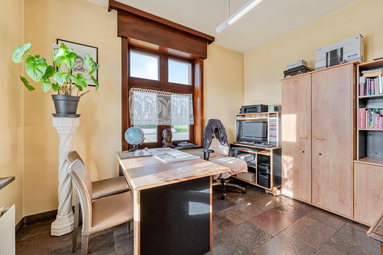 Op het gelijkvloers vinden we een bureauruimte, grote leefruimte met zithoek, eetplaats en open keuken voorzien van alle nodige toestellen. Door de vele raampartijen hebben we hier veel licht. Verder is er nog een berging en een garage met wasplaats. Op het gelijkvloers bevindt zich nog de badkamer met lavabo, inloopdouche en ligbad.