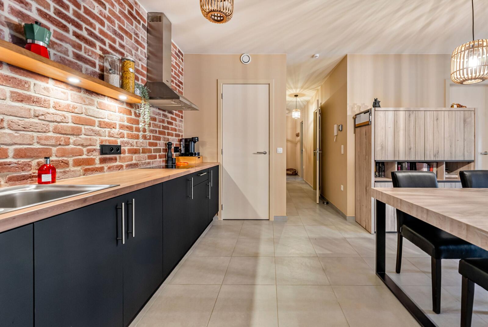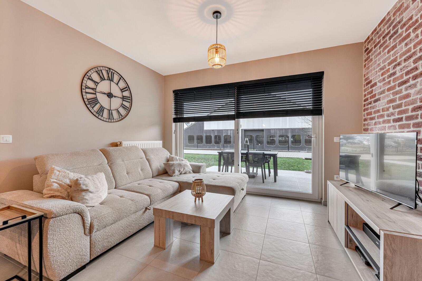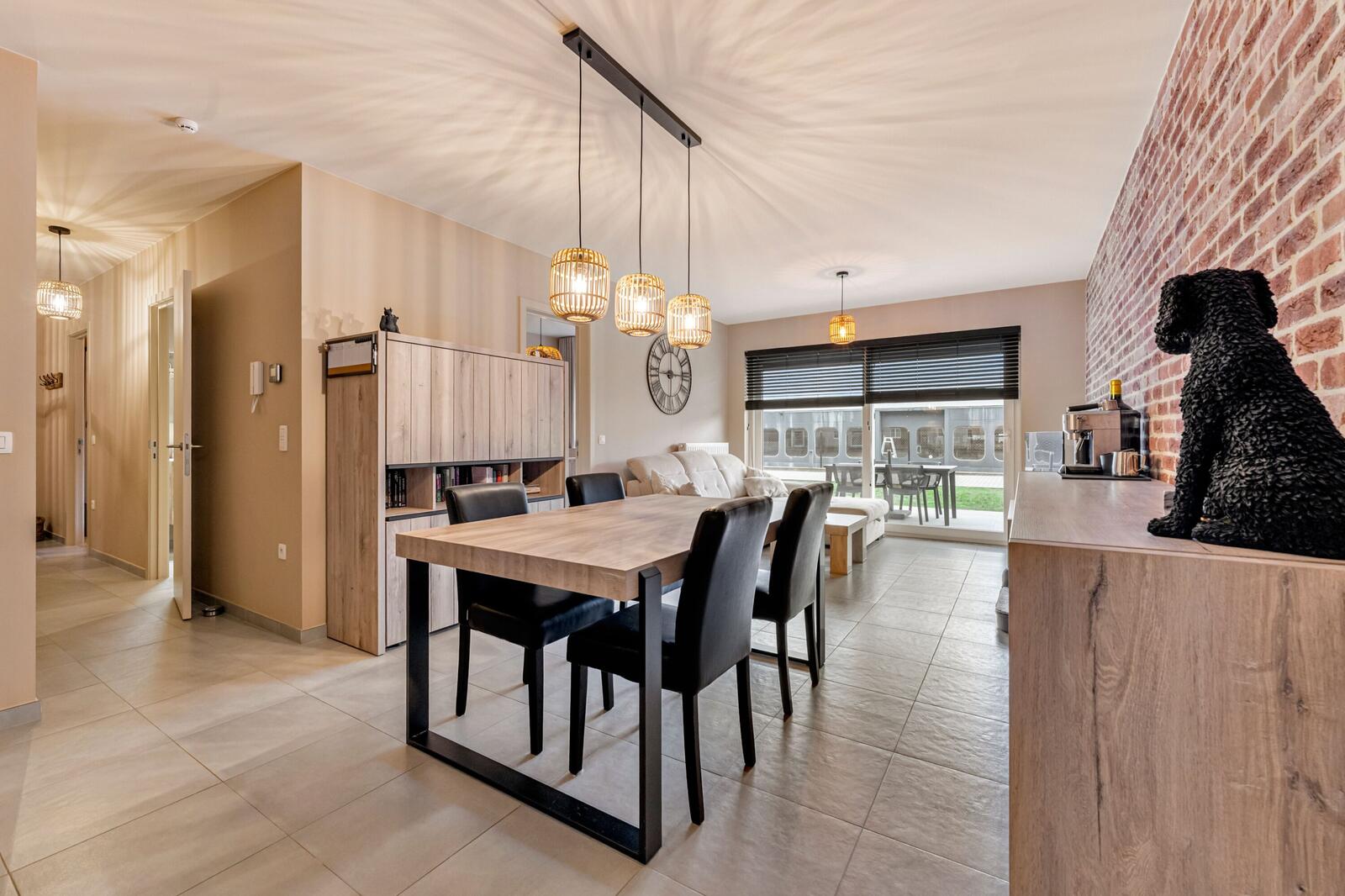 De lichtrijke leefruimte beschikt over ee eetplaats met zithoek en open keuken.