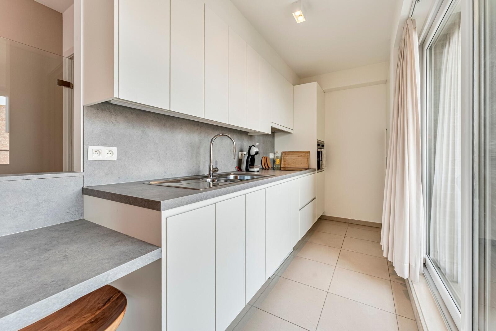 Je betreedt het appartement via de inkomhal en komt vervolgens in de lichtrijke leefruimte met zithoek en eetplaats. Dankzij de grote raampartijen geniet je hier de hele dag van natuurlijk licht. Aansluitend bevindt zich de keuken.