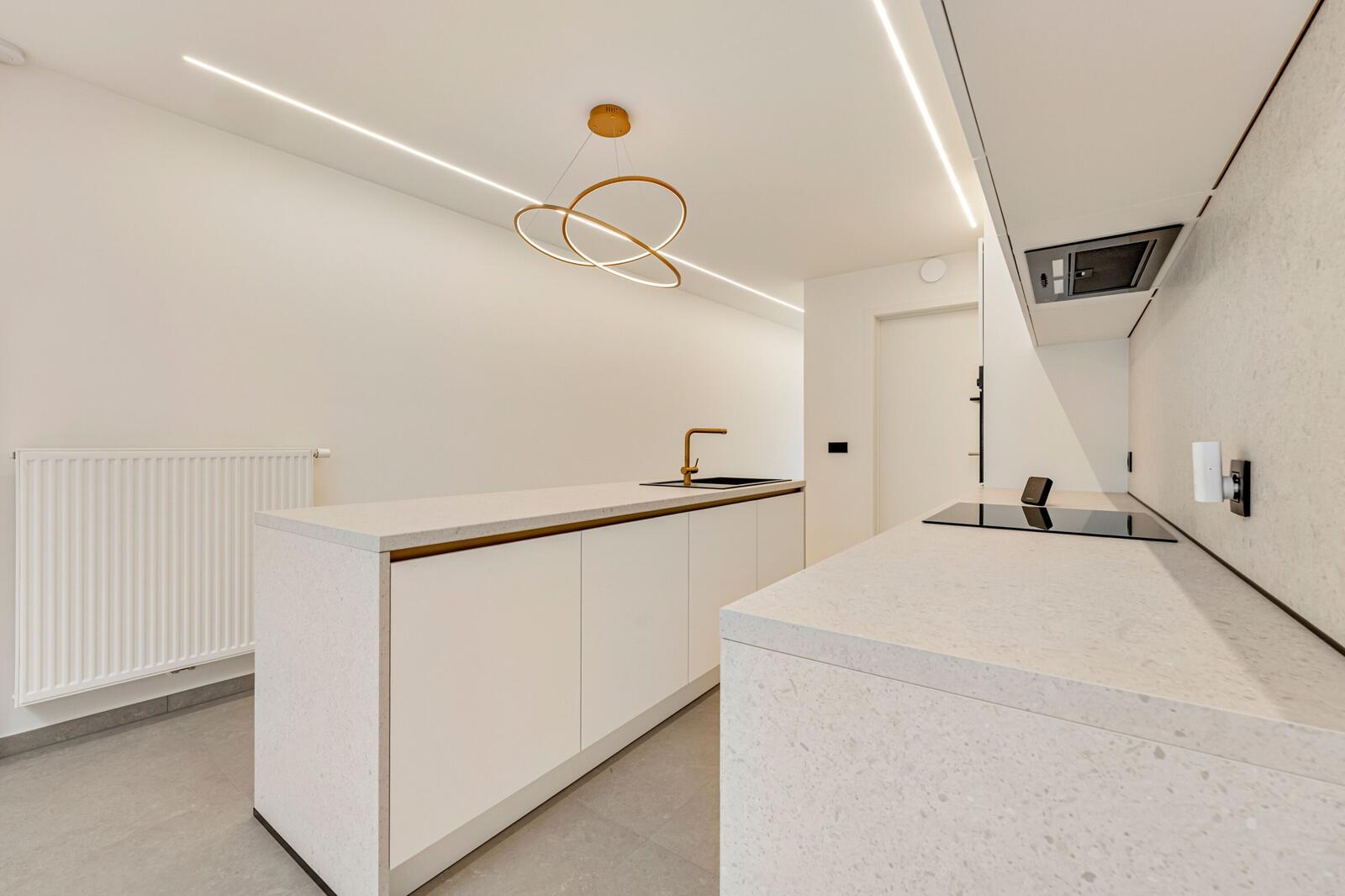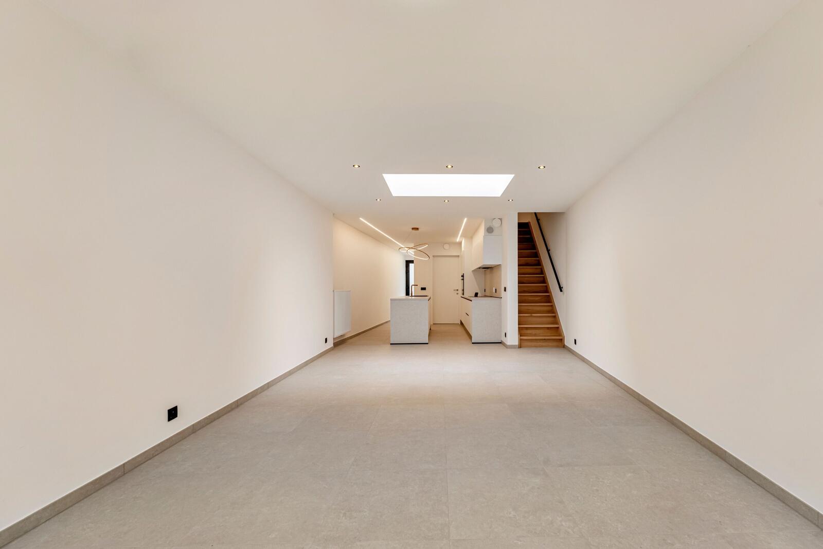 Bij het betreden van de woning komen we in de inkomhal met gastentoilet, verder leidt de inkomhal ons naar de gezellige leefruimte met open keuken. De keuken is voorzien van eiland met mogelijkheid om aan te zitten. Aansluitend bevindt zich de praktische berging. De berging is zeer ruim en hier zitten alle technieken alsook de aansluiting voor de wasmachine en droogkast.