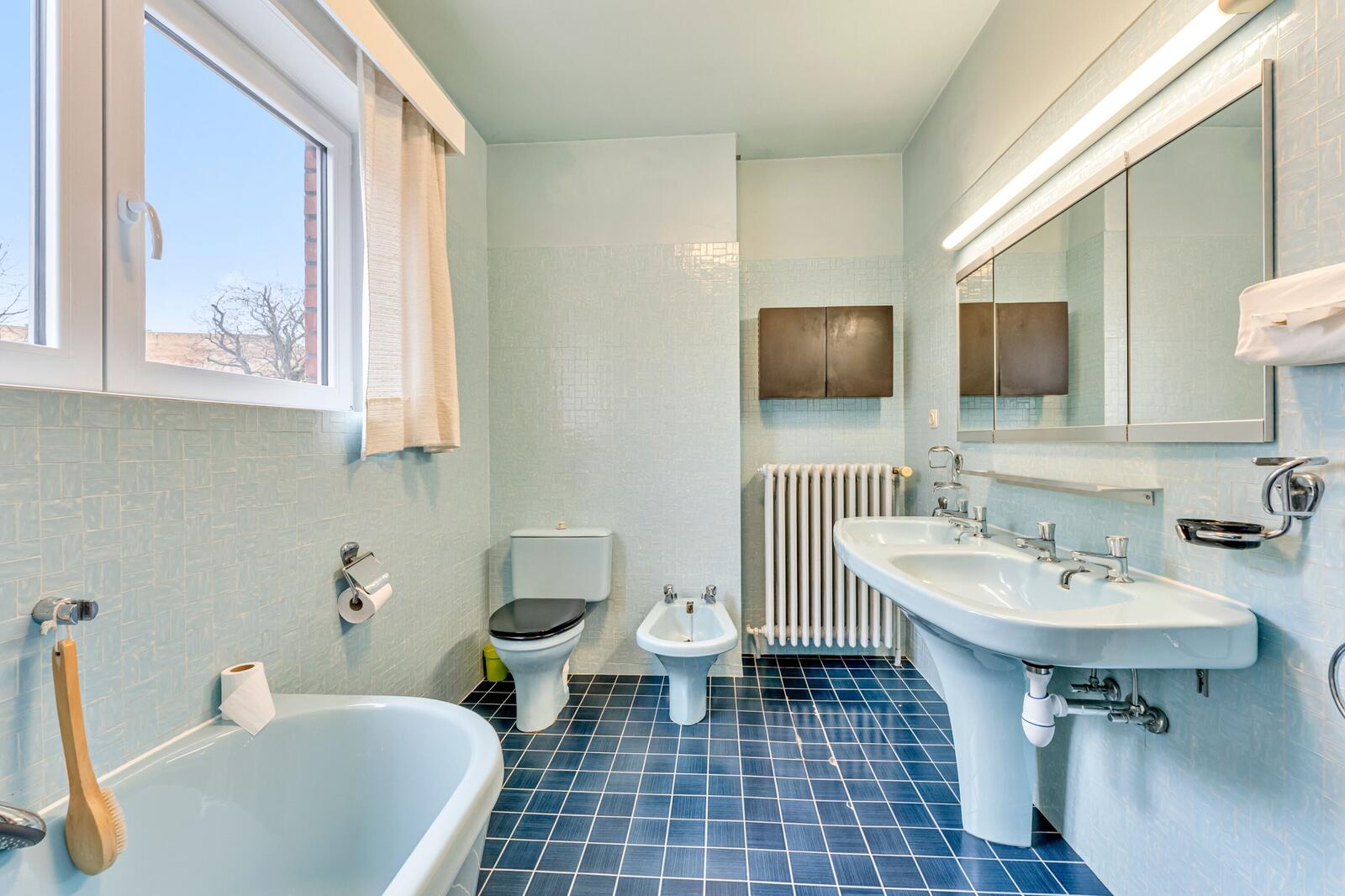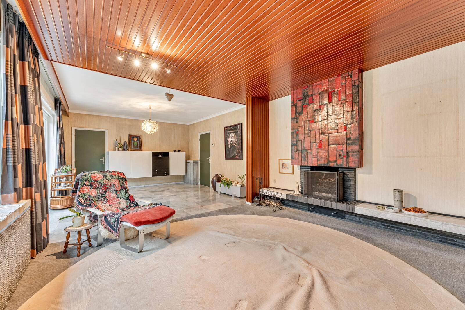 Via het prachtige glasbeton betreden we de gezellige woonkamer, waar de typische en smaakvolle elementen uit de jaren ’60 meteen in het oog springen. Authentieke details zoals de schouw, vensterbanken en verwarmingselementen geven de woning haar unieke karakter.