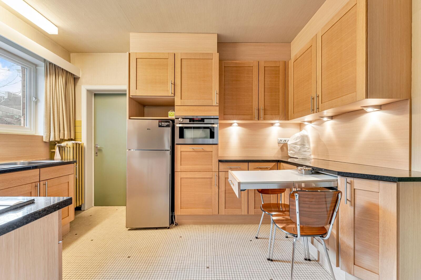 Aansluitend vinden we de keuken, die doorloopt naar de achterkeuken/wasplaats. Van hieruit heeft u toegang tot het gezellige stadstuintje met terras en regenput — een zeldzame troef in het centrum van de stad.