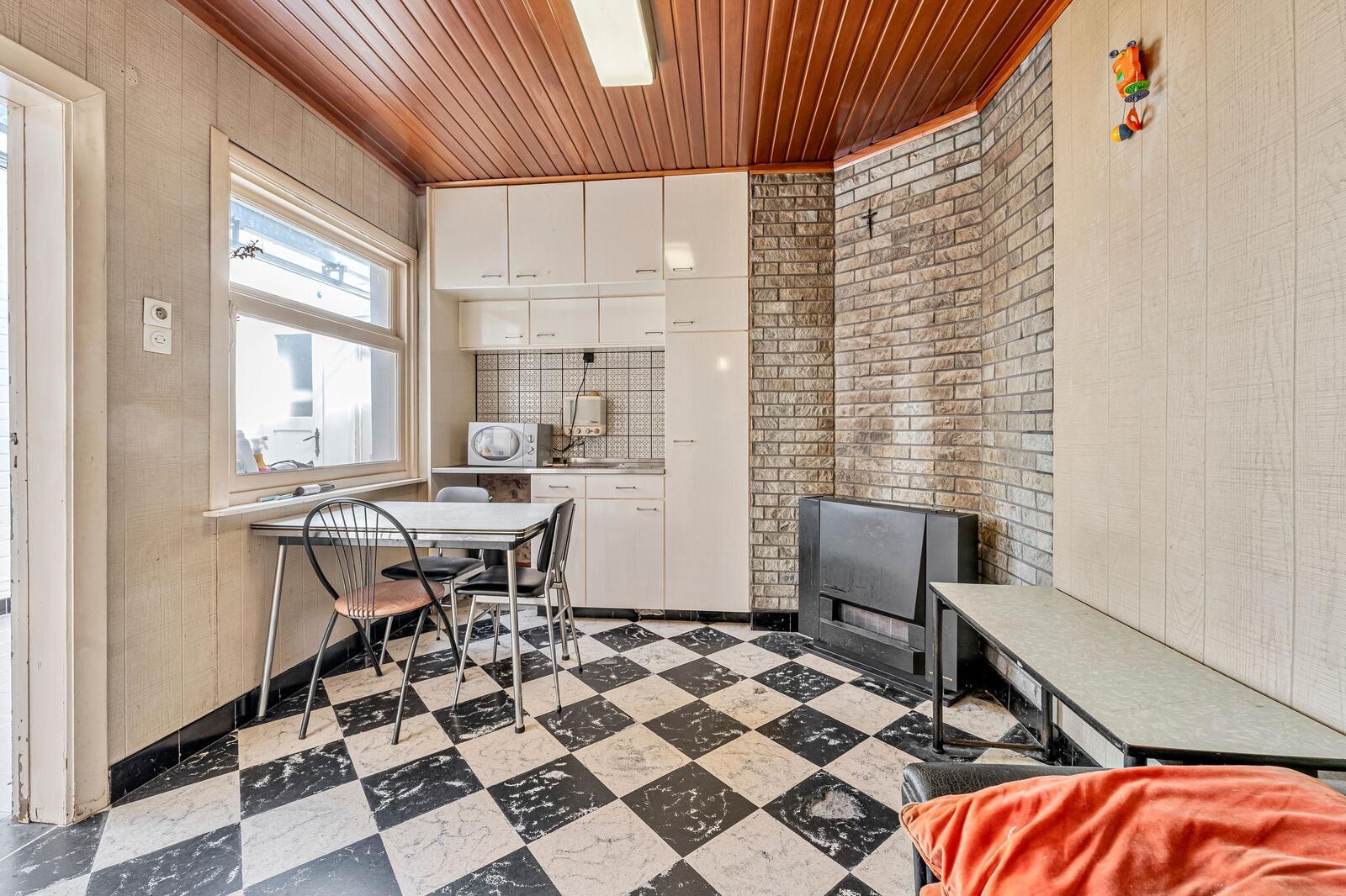 Het woongedeelte is wel te renoveren. We vinden er op het gelijkvloers een keuken, een badkamer met douche en toilet en nog een zithoek.
