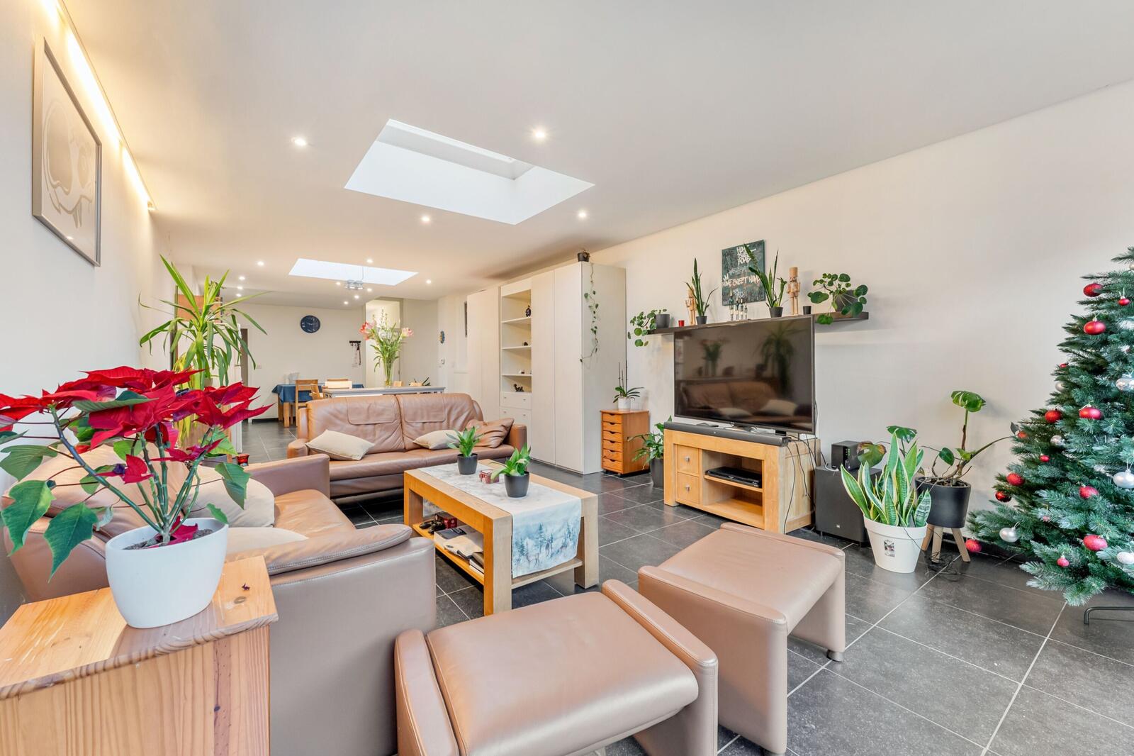 Achter de inkomhal ligt de open en instapklare keuken. Aanpalend hebben we de eetplaats en de ruime zithoek met zicht op de tuin. De tuin is voorzien van een terras, gras en een berging.
